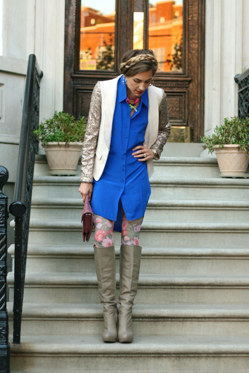 The cobalt shirt dress is so pretty! I love how styled in such a fun way with the floral leggings and glittery blazer!
