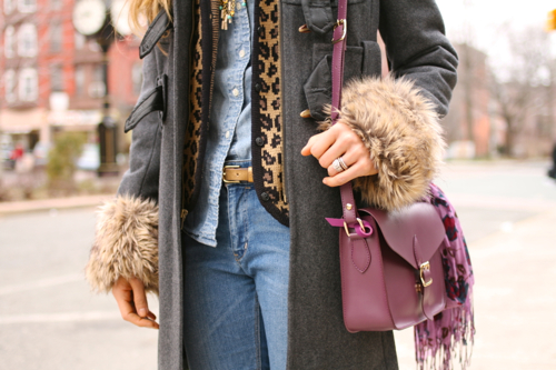 The ultimate weekend-wear, in my book: my favorite denim workshirt with high-waisted skinny jeans, comfy wedge boots , plenty of warm layers and a felt hat to cover my day-9 unstyled hair. I added a floral scarf and fringe-y necklace for fun, gave my new shoulder satchel it’s first test-drive, and was able to accessorize with my favorite kind of arm candy: A cute dude! (And no, it’s NOT Mr. Pepper!)