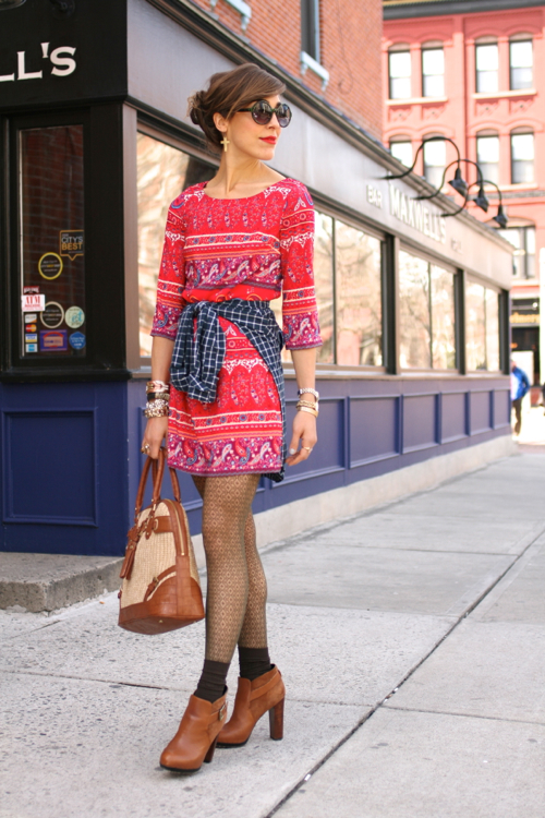 I love that dress with those tights – and thanks for doing your part to bring on some warmer weather here in NYC :).